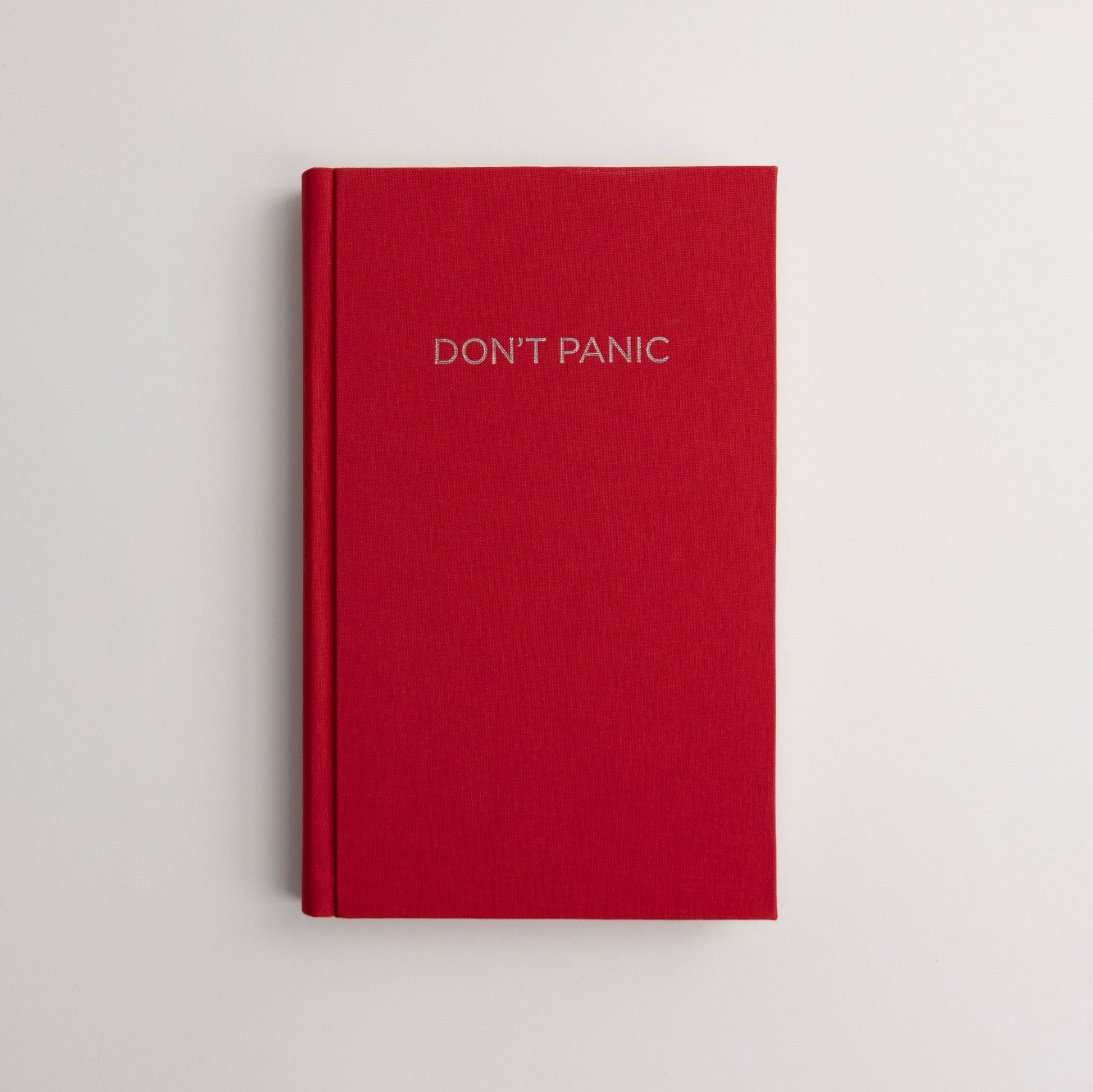 A red hardcover journal with the message “Don’t Panic” embossed in silver foil, a gentle reminder to take things one page at a time.