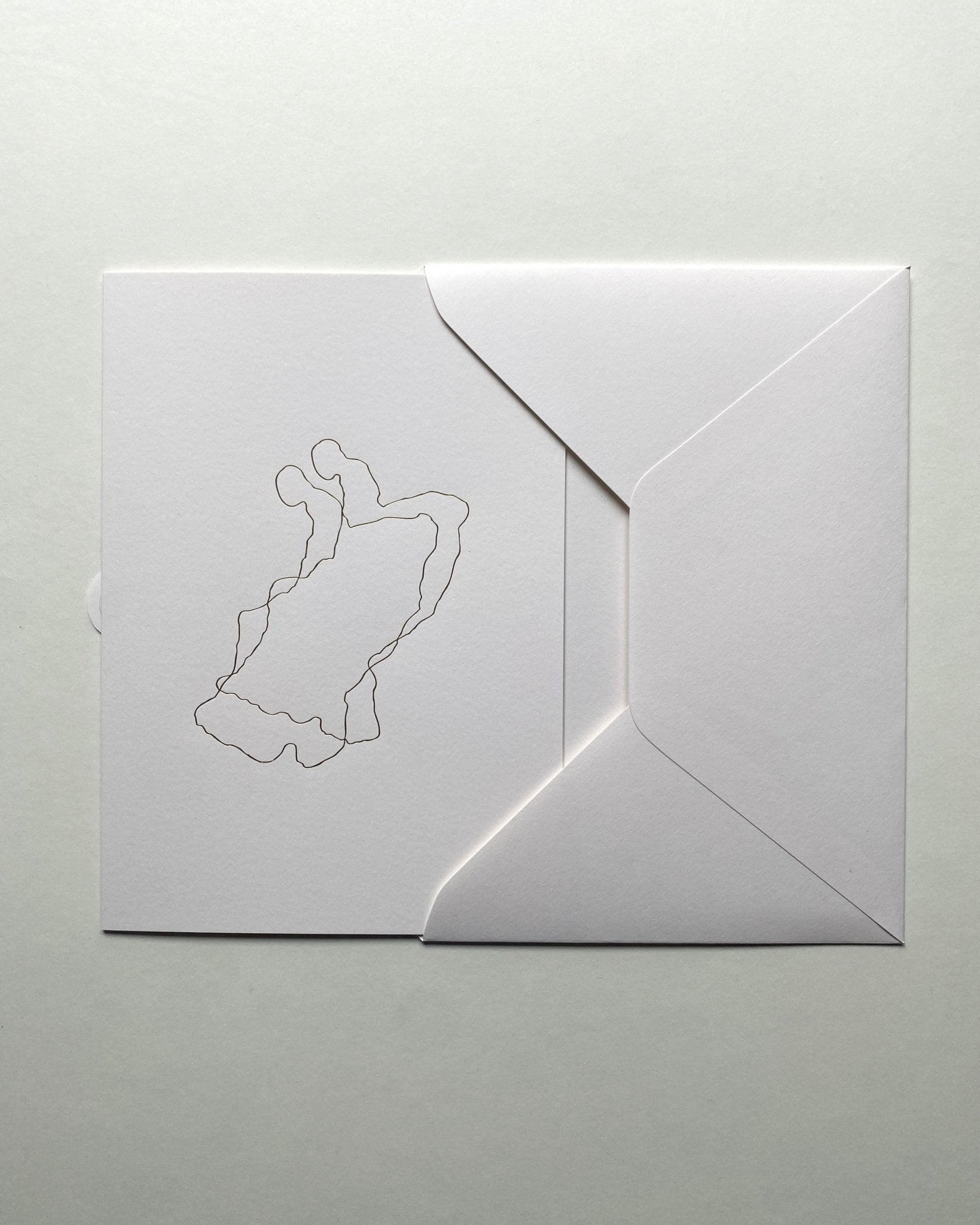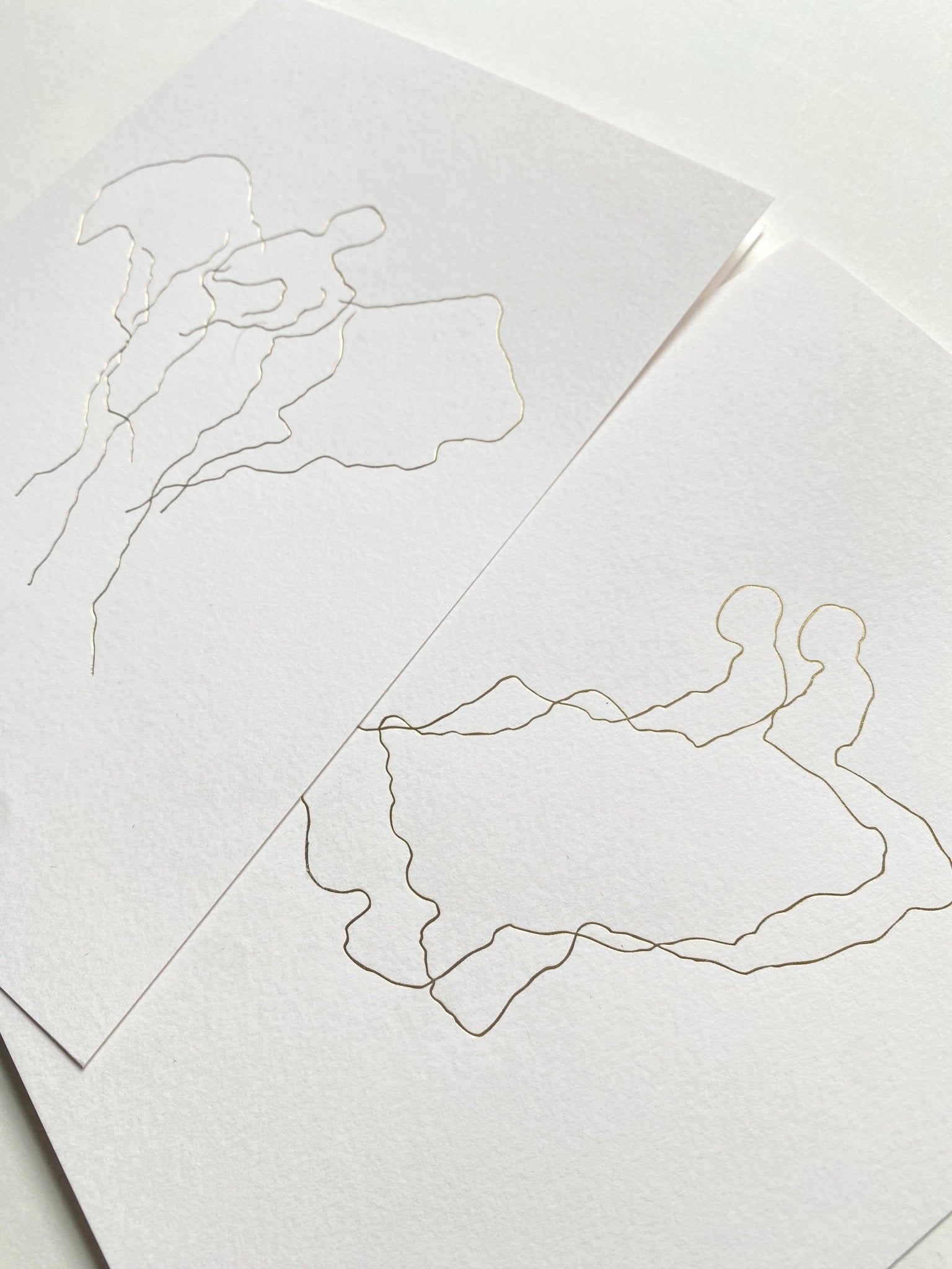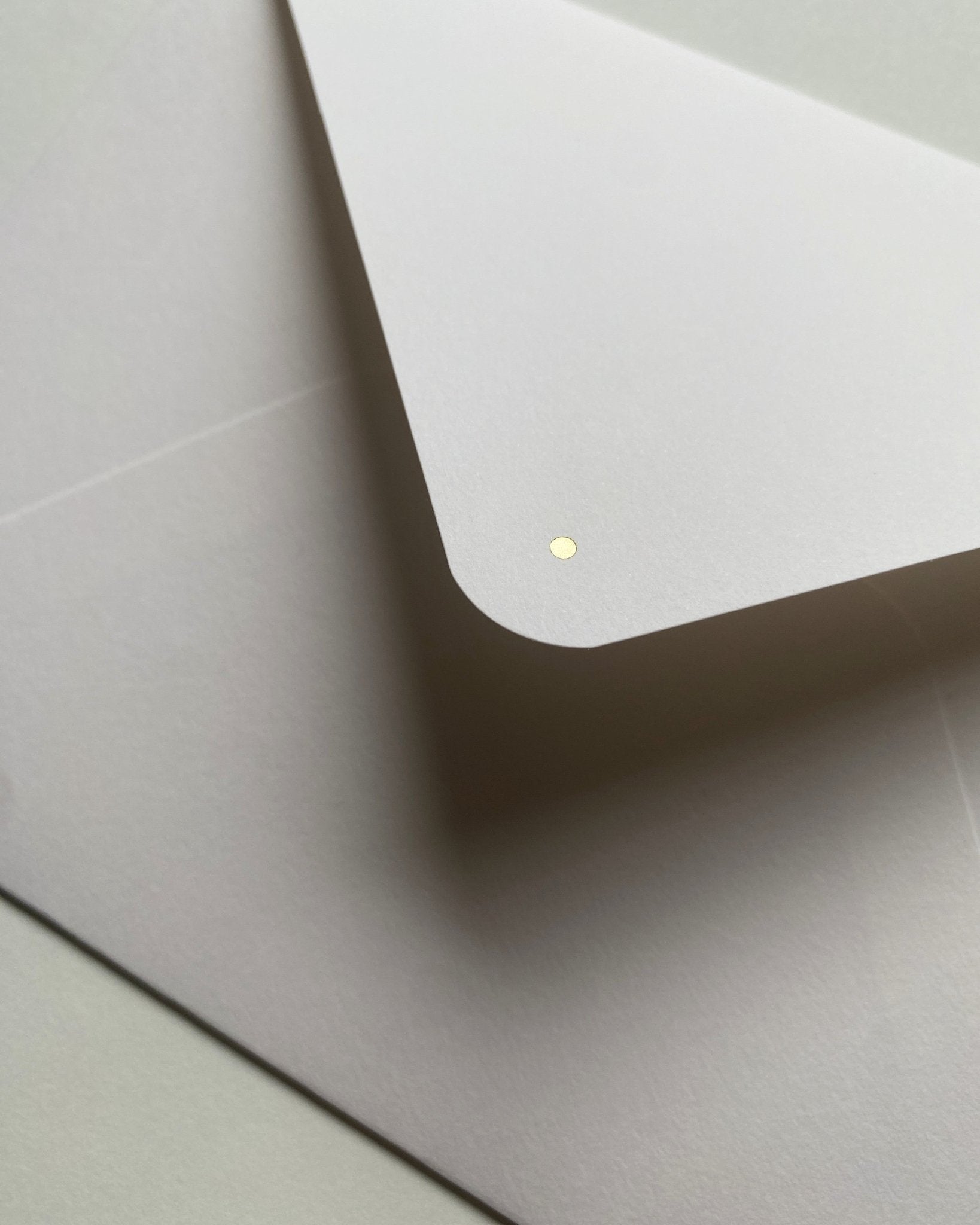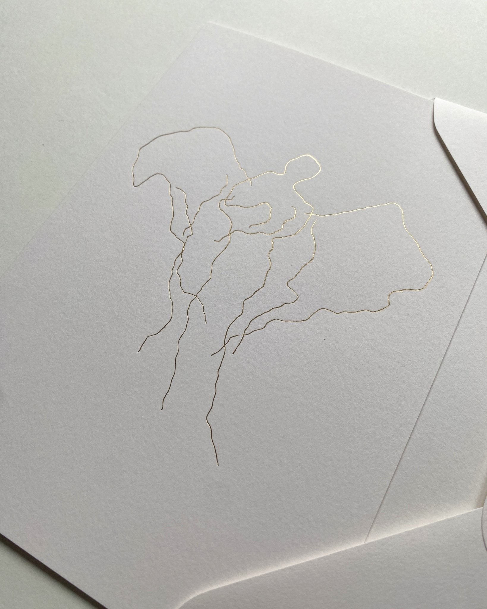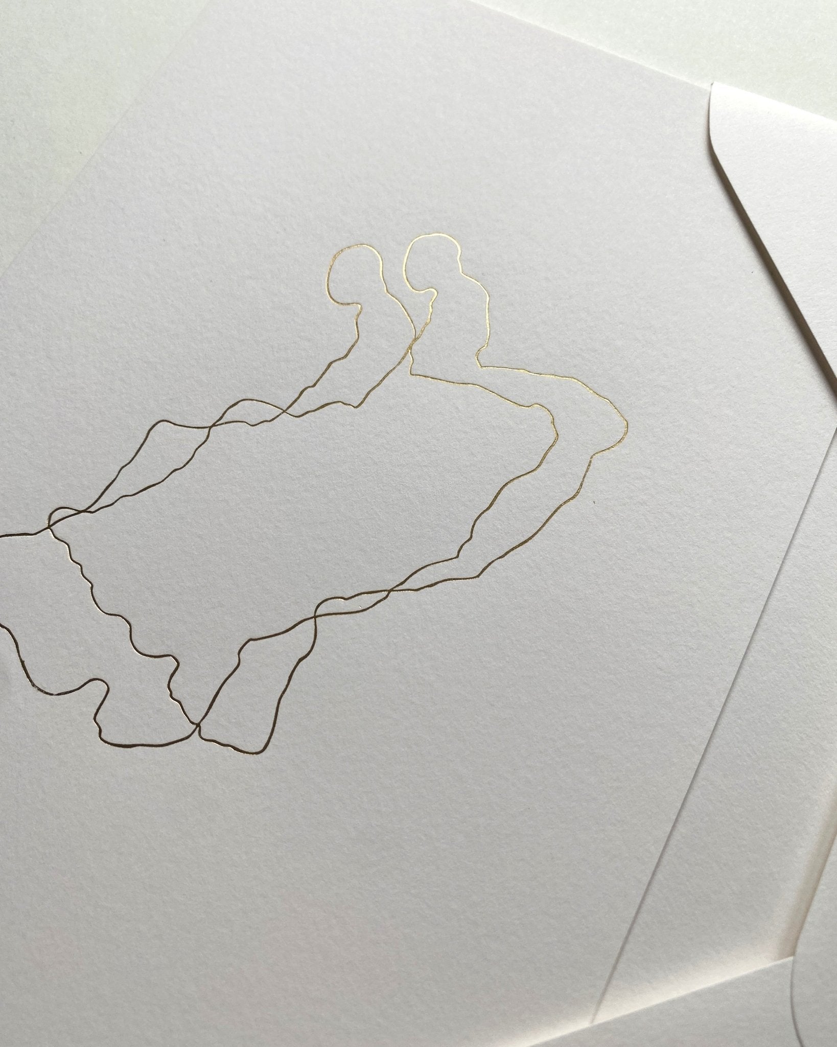 Epilog card made from high-quality paper, featuring a gold foil design, kept in an envelope with a gold foil detail on the flap.